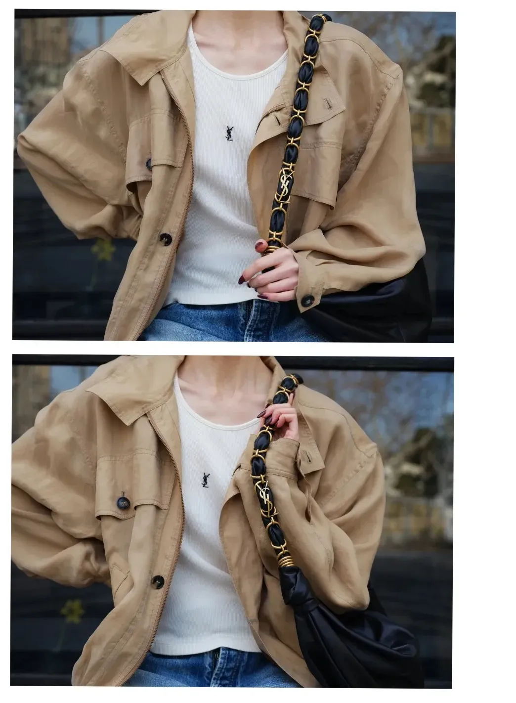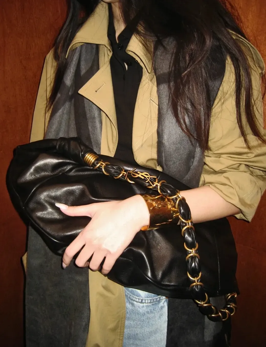 ラムスキン製ホーボーバッグ。編み込みのYSLモノグラムジュエリーチェーンで仕上げています。