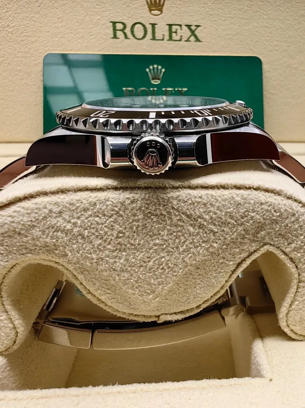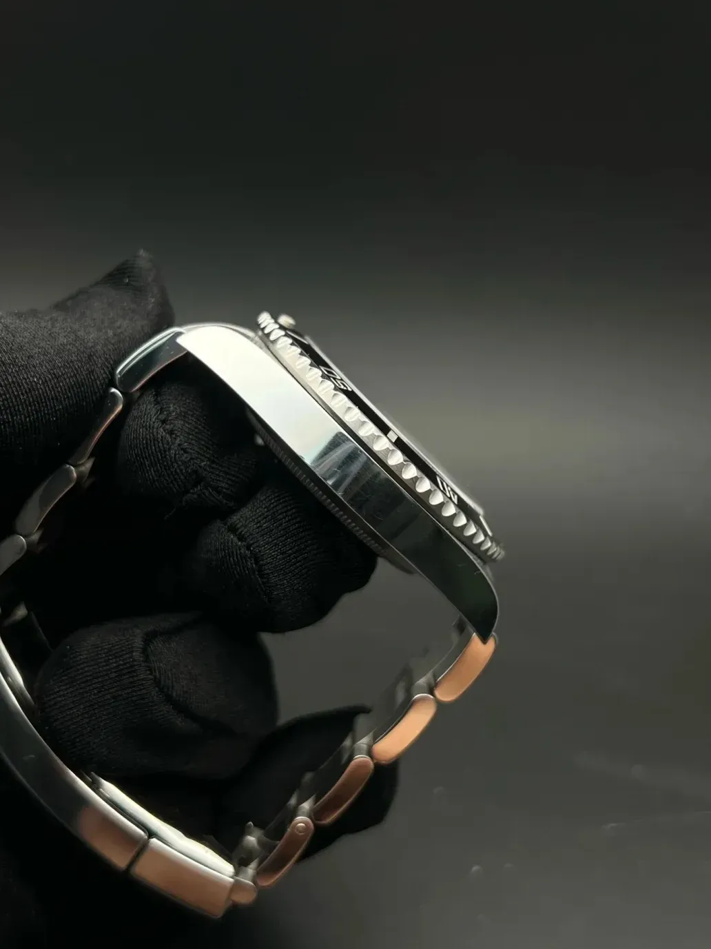 • ベゼル 60 分目盛り入り逆回転防止、耐傷性に優れたブラックのセラミック製セラクロムベゼルインサート、数字と目盛りはプラチナコーティング
