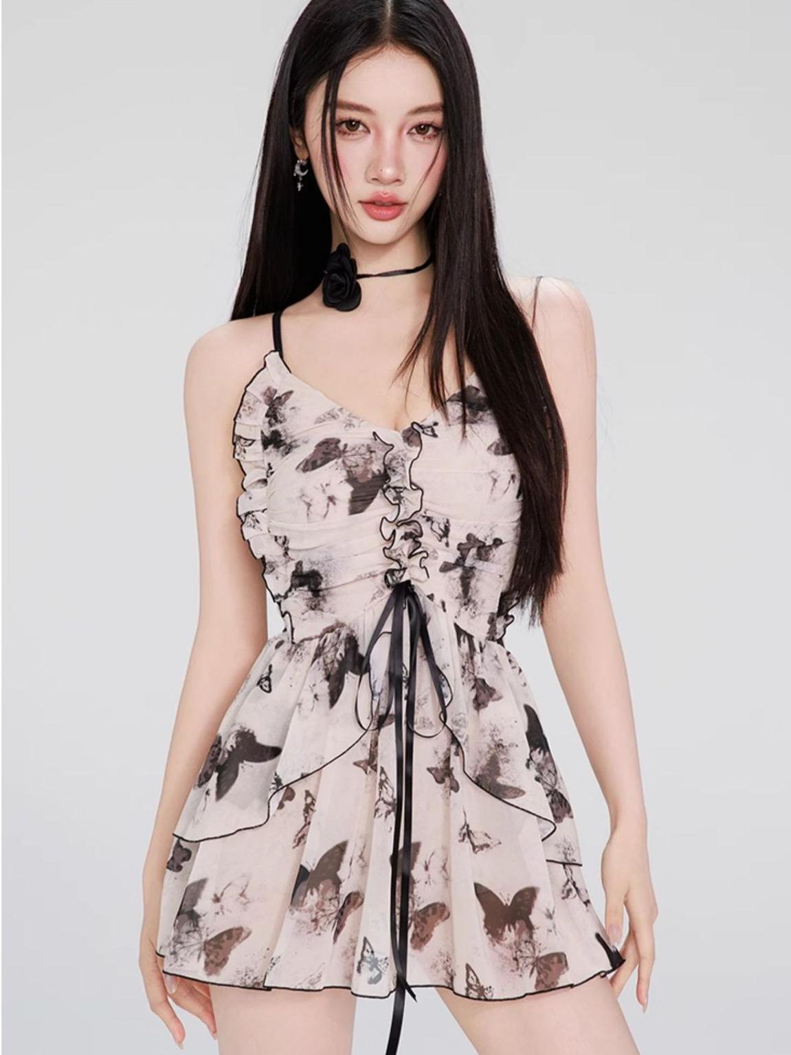 蝶柄で程よい甘さを演出、大人のビーチスタイルにぴったり